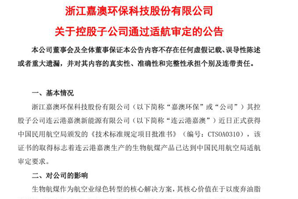 2025年03月14日,浙江嘉澳环保科技股份有限公司发布《关于控股子公司通过适航审定的公告》。图源:嘉澳环保公告 浙江嘉澳环保科技股份有限公司其控股子公司连云港嘉澳新能源有限公司近日正式获得中国民用航空局颁发的《技术标准规定项目批准书》(编号:CTSOA0310),该证书的取得标志着连云港嘉澳生产的生物航煤产品已达到中国民用航空局...