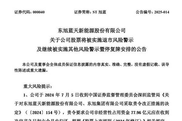 3月5日晚间,东旭蓝天新能源股份有限公司(简称:ST旭蓝)公告称,因公司未能在规定期限内完成非经营性资金占用的整改工作,根据相关规定,其股票将被实施退市风险警示。此举意味着ST旭蓝财务状况和经营风险已攀升至新的高度,为广大投资者敲响了警钟。 据悉,2024年7月5日,ST旭蓝接到了监管机构的整改通知,要求其六个月内归还77.96亿元...