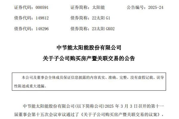 中节能太阳能股份有限公司(简称:太阳能)近日公告称,公司全资子公司中节能太阳能科技有限公司(下称“太阳能科技”)拟购买中节能首座(北京)建设有限公司(下称“首座公司”)开发建设的位于北京市大兴区西红门镇中节能•汇中心项目 12 号楼 13 处房产,建筑面积为 10,144.25...