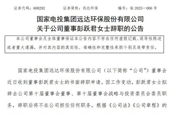 国家电投集团远达环保股份有限公司(简称:远达环保)2月11日公告称,公司董事会近日收到董事彭跃君女士的书面辞职申请。因工作变动,彭跃君女士拟辞去公司第十届董事会董事、第十届董事会战略与投资委员会委员职务,辞职后将不在公司担任任何职务。图源:远达环保公告 申明:本站发布此信息的目的在于传播更多信息,与本站立场无关。并且郑重提示所有阅读...