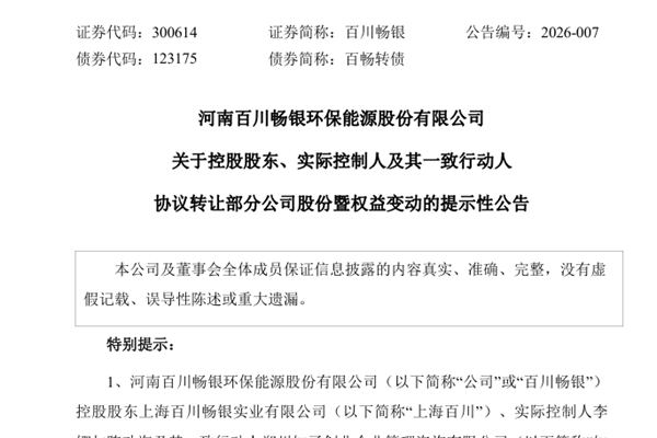 近日,河南百川畅银环保能源股份有限公司(简称:百川畅银)发布公告,宣布公司控股股东上海百川畅银实业有限公司、实际控制人李娜与陈功海及其一致行动人郑州知了创业企业管理咨询有限公司与江苏能源物资有限公司签署了《股份转让协议》,上海百川、知了创业、李娜拟通过协议转让方式以人民币12.68元/股的价格将其合计持有的公司16,044,067股无...